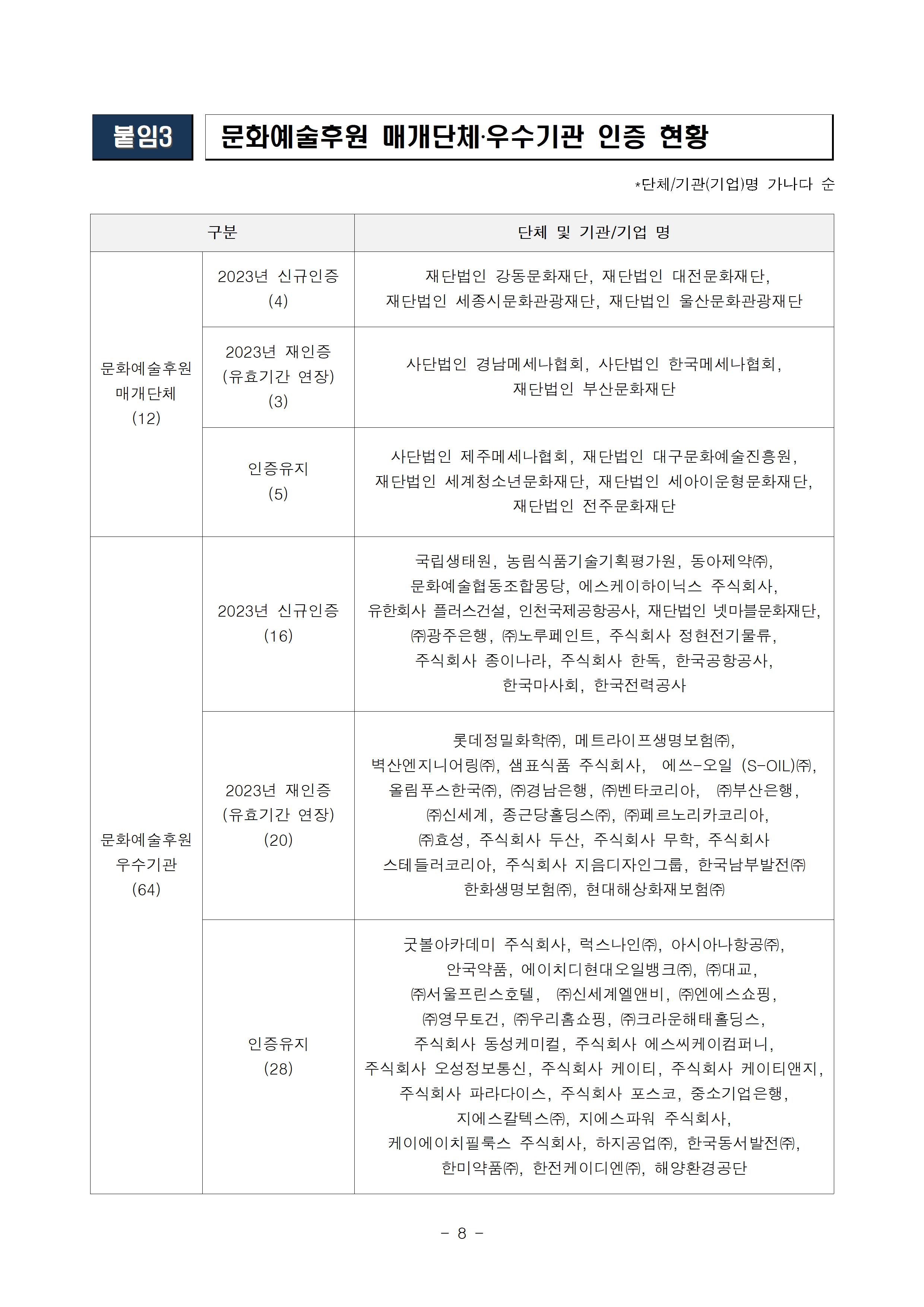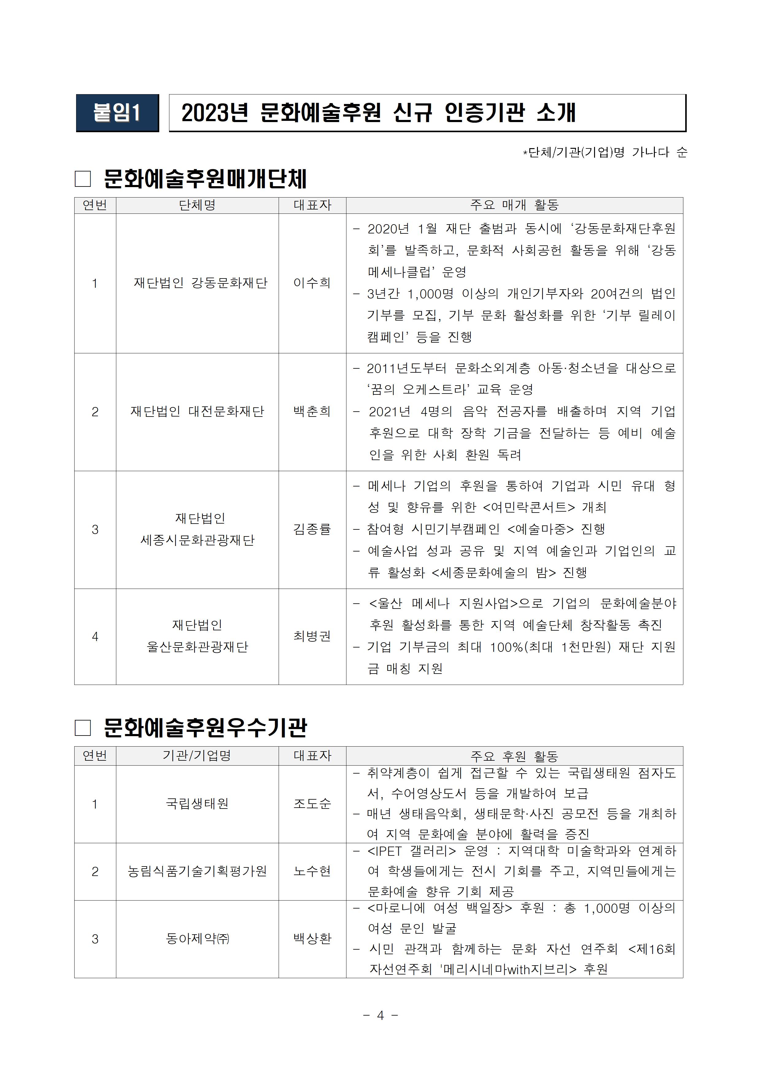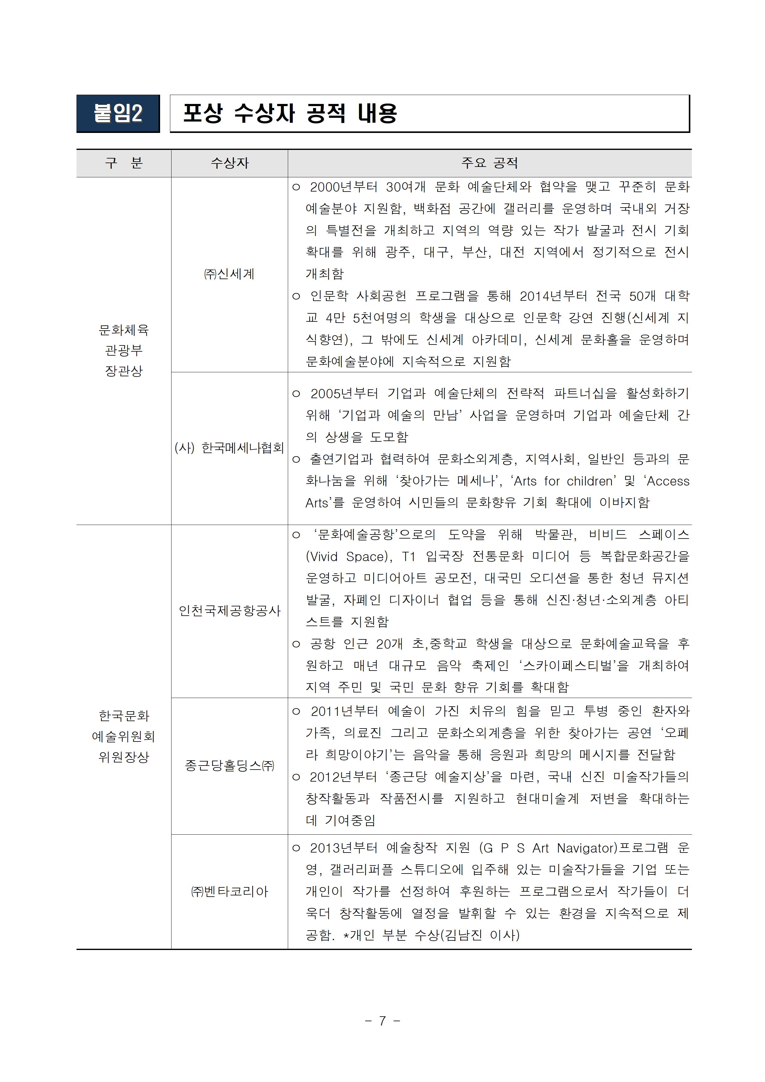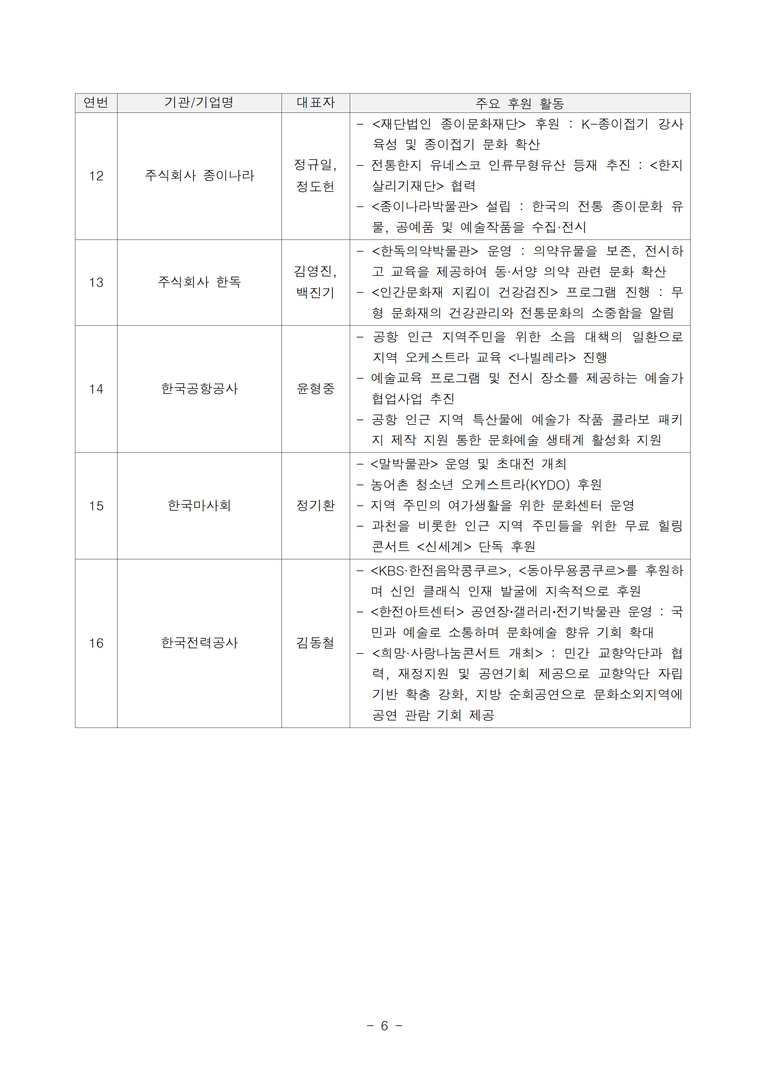- 문화예술 분야에 기부, 문화예술 행사 개최로 기여해 온 기업/단체를 인증
